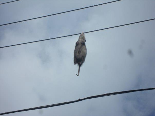 La semana pasada apareció una rata enorme colgada de su hocico en las cuerdas de la luz, seguramente electrocutada, esa mañana cuando salimos al patio nos esperaba esa escena, y mi nieta armó una historia que incluía los supuestos gritos que la rata emitió antes de morir, su historia aunque no era perfectamente audible, era comprensible por todos, su día giró alrededor de esa historia, incluso cuando alguien llamaba por teléfono, ella pedía que la pusiéramos en el teléfono para contar la historia de la rata que gritó antes de quedar colgada allí.